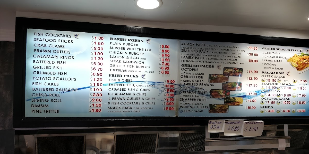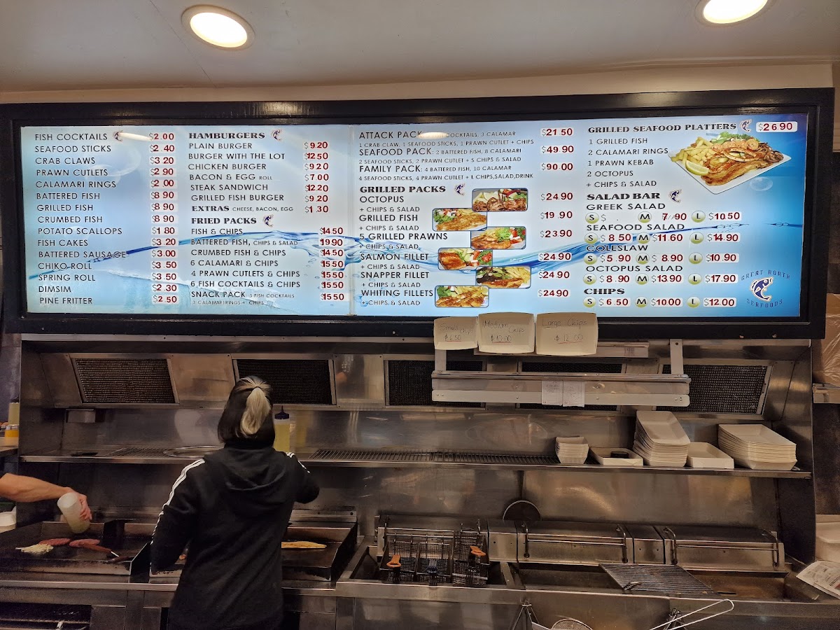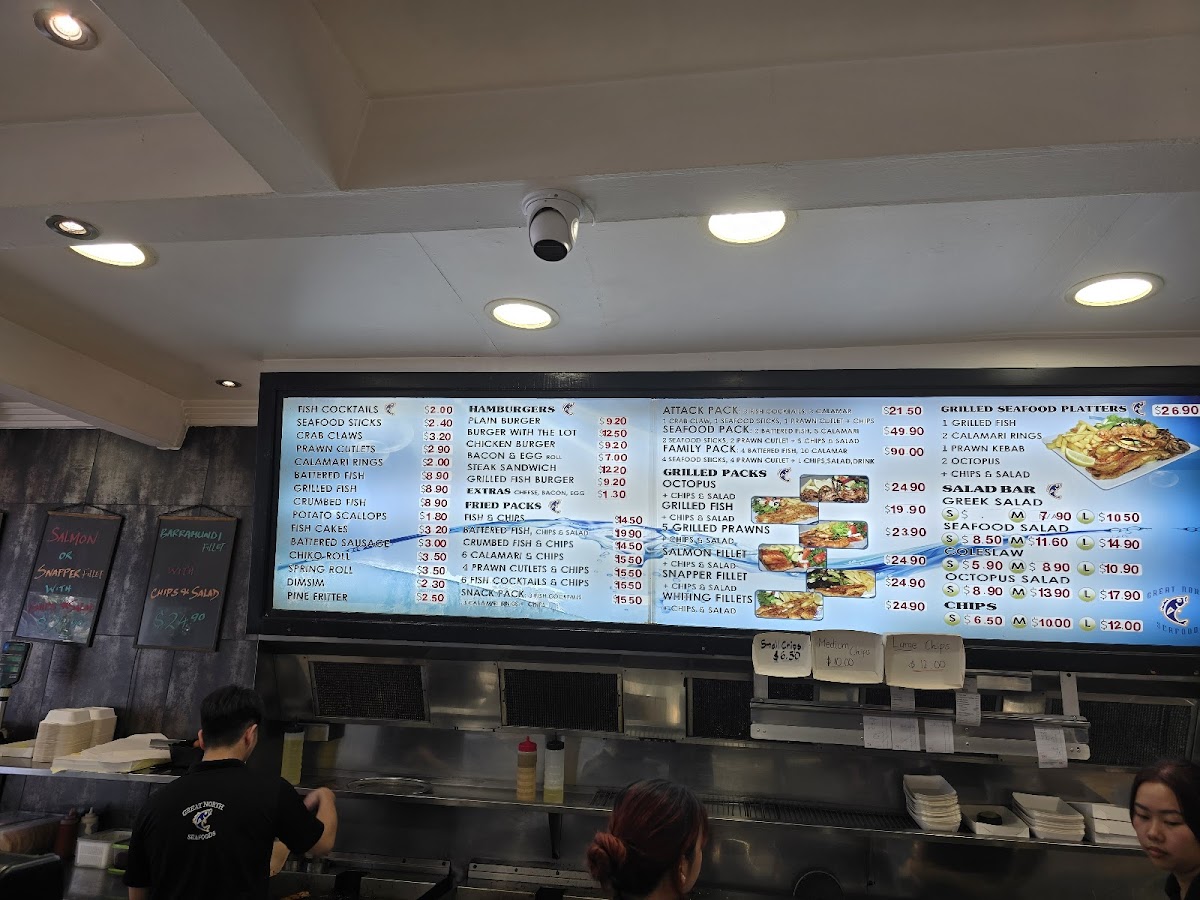 The menu at Great North Seafoods Five Dock offers a diverse range of fresh seafood and delicious options for every taste. For those looking for grilled dishes, the Grilled Prawns Pack, Grilled Seafood Platters, and Grilled Snapper Fillet Pack are standout choices. If you're after a classic fried option, try the Family Pack or Crumbed Fish and Chips, while the 6 Calamari and Chips is another popular favorite. For a lighter bite, the menu also includes Seafood Sticks and Calamari Rings. Salads such as Greek Salad, Seafood Salad, and Octopus Salad provide refreshing accompaniments, while the Seafood Sauce and Tartare Sauce add an extra flavor punch. Fresh seafood lovers can indulge in 1 Kg Cooked Tiger Prawn or 1 Dozen Sydney Rocks Oysters. The Hamburgers section offers a variety of choices, from a Plain Burger to a Grilled Fish Burger with all the fixings. Complement your meal with a drink like a 390Ml Coke Zero or 600Ml Powerade Gold Rush. Overall, the menu is a perfect mix of fresh, grilled, and fried options, providing something for everyone to enjoy.