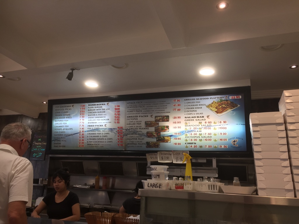 Four battered fish, ten calamari, four seafood sticks, four prawn cutlets, large chips, salad and a drink.
